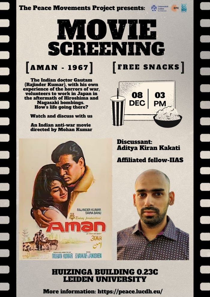 Join us in room 023C of the Huizinga Building for a movie-themed iteration of our peace movement seminar series! Aditya Kiran Kakati will introduce the anti-war movie Aman (1967). Snacks will be provided during the screening. This will be our last event of the Fall semester. Do join us, and feel free to bring others!