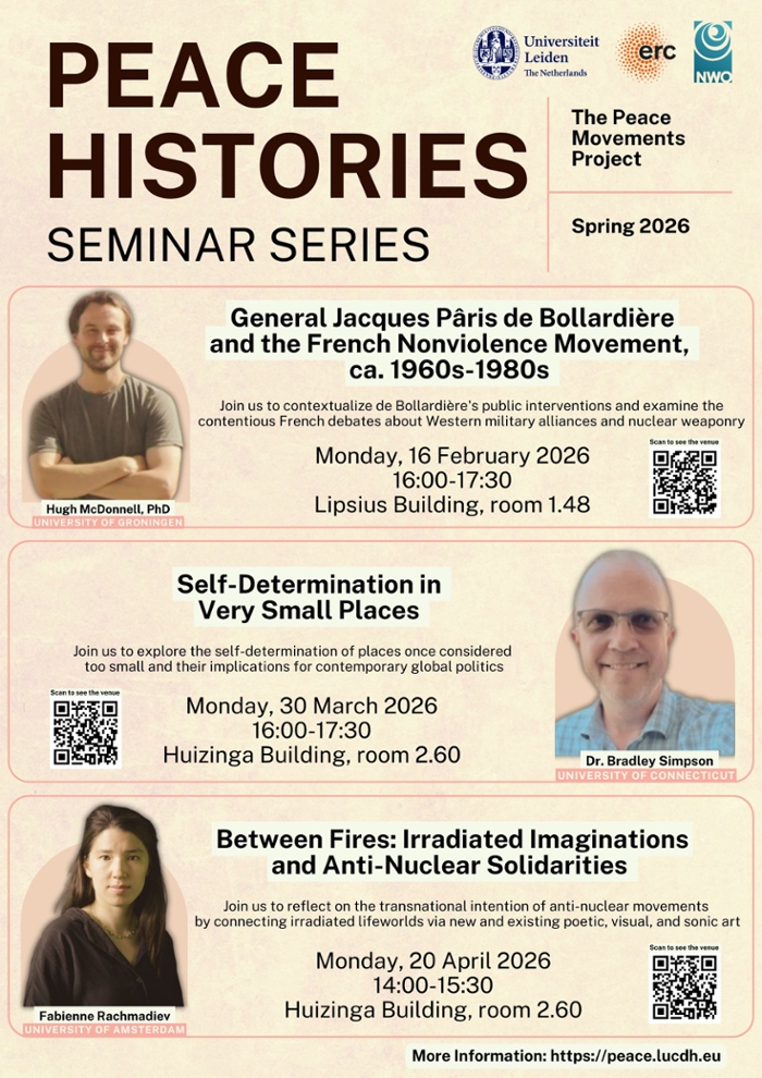 The Peace Movements project proudly presents the Peace Histories Seminar Series! This series of talks provides a space for students and faculty to discuss how different actors, organisations, powers, and regions perceive peace. We invite speakers to present frontline research on a specific historiography of peace, after which the floor is opened for discussion. All events are held at the Humanities Faculty in Leiden and open to the public. Join us!